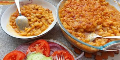 U đuveč sipati malo pasulja pa dodati luk, paszlj, luk pasulj. Odozgo sipati malo ulja i paprike i preliti . Staviti u rernu na 220 stepeni C da se pasulj zapeče oko 30 minuta.