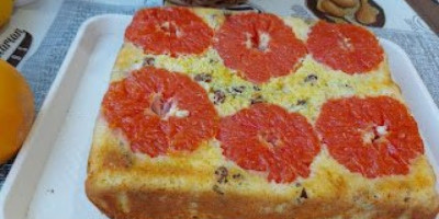 Grejfurt oguluti i iseći na pola. Jaja umutiti sa šećerom dodati brašno i griz prosejano sa praškom za pecivom. Dodati ulje, jogurt suvo groždje korica limuna , sve izmešatim .