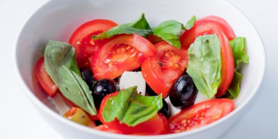 Paradajz isecite na polovine, a mocarelu iskidajte na manje komade. Stavite ih u posudu, dodajte im na kolutiće iseckane masline, listiće bosiljka i pažljivo promešajte.