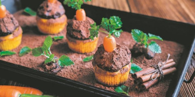 U većoj činiji pomešati brašno, prašak za pecivo, cimet i so. U drugoj posudi umutiti šećer, ulje i jaja. Dobijenu smesu dodati u činiju sa brašnom, sve dobro sjediniti, te umešati rendane šargarepe, jabuku i suvo grožđe. Izliti u podmazane kalupe za mafine i peći u rerni na 180 stepeni 25 minuta. Pomešati istopljenu čokoladu, kokos i maslac, preliti mafine, po želji ukrasiti komadićima sveže šargarepe, pa poslužiti.