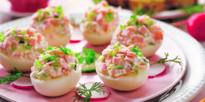 Žumanca izgnječite viljuškom, pomešajte sa šunkom isečenom na sitne komade, senfom, sirom i majonezom. Ovom smesom filujte jaja i služite kao hladno predjelo.