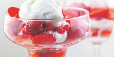 Jagode oprati, posuti šećerom i zaliti ih crnim vinom da ogreznu. Preko njih nerendati, po ukusu, muskatni oraščić i dodati mleveni cimet. Činiju sa jagodama ostaviti na sat u frižideru da se rashlade. Umutiti slatku pavlaku, pa pre služenja u posudice za sladoled na dno staviti po jednu kuglu sladoleda ili kašiku, dve umućene pavlake, zatim jagode sa vinom, a na kraju opet pavlaku i malo crnog bibera.