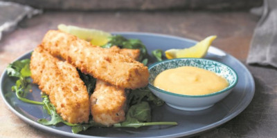 Iseći filete ribe na štapiće i preliti sa malo maslinovog ulja. U jednu posudu sipati brašno, a u drugoj pomešati prezle sa limunovim sokom i kašičicom belog luka u prahu. Svaki štapić ribe prvo uvaljati u brašno pa u prezle. Poređati ih u pleh obložen papirom za pečenje, poprskati maslinovim uljem i peći 20 minuta u rerni zagrejanoj na 200 stepeni. Ostaviti da se malo ohlade. Za sos izgnječiti beli luk, preliti sokom od limuna, ostaviti da odstoji desetak minuta, pa potisnuti kroz cediljku u manju posudu. Dodati tahini, so i kumin, pa postepeno dodavati vodu i mešati dok se ne dobije sos željene gustine. Ribu služiti uz sos.