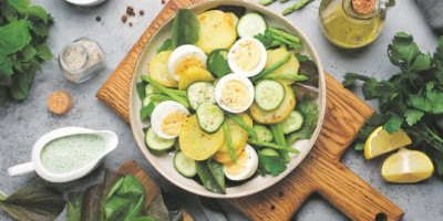 Krompir i špargle skuvajte posebno, krompiru će trebati oko 20 minuta, šparglama 5-7 minuta, kuvana jaja vać imate. Za dresing pomešajte ulje, limunov sok, senf, iseckani beli luk i začine. Iseckajte i pomešajte sastojke za salatu i prelijte dresingom.
