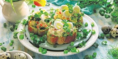Smrznuto povrće skuvati u slanoj, ključaloj vodi, prema uputstvu sa pakovanja, pa ocediti i staviti u činiju. Dodati iseckanu šunku, ćureći file, krastavčiće, so, biber i majonez. Sve dobro sjediniti, pa salatom premazati hleb isečen na kriške. Odozgo poslagati jaja, posuti iseckanim zelenim percima mladog luka, začiniti mirođijom i peršunom, pa odmah poslužiti.