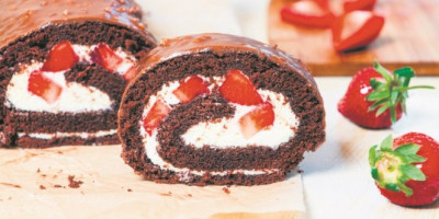 Za biskvit penasto umutite belanca, dodajte šećer, a kad se otopi, dodajte žumanca, pa ulje, mleko i na kraju sjedinjene suve sastojke. Pleh (30x30 cm) obložite papirom za pečenje i pecite biskvit desetak minuta na 180 stepeni. Prohladite par minuta, pa uvijte (zajedno sa papirom) i upakujte u vlažnu krpu. Za fil umutite slatku pavlaku i dodajte šećer po ukusu. Jagode iseckajte na sitnije komade i sjedinite sa pavlakom. Odvijte biskvit, premažite ga mlakom marmeladom po izboru. Preko namažite fil od jagoda i slatke pavlake. Urolajte ga. Rolat premažite marmeladom i sa gornje strane. Prelijte ga istopljenom čokoladom i dekorišite jagodama.