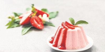 Namažite osam posudica (čašica) masnoćom po izboru. Jagode ispasirajte u blenderu, procedite i dodajte vanilu. Odvojte jednu šolju od smese. Pomešajte želatin sa vodom i ostavite na par minuta. Stavite posudu na paru da se želatin rastopi. Ugrejte mleko i skinite sa vatre. U njega dodajte želatin. Pomešajte sa jednom šoljom smese od jagode i pavlakom. Dobro mutite. Sipajte u posude i pokrijte. Stavite u frižider na par sati. Okrenite krem na tanjire i ukrasite celim jagodama, a preostali pire od jagoda koristite kao sos.