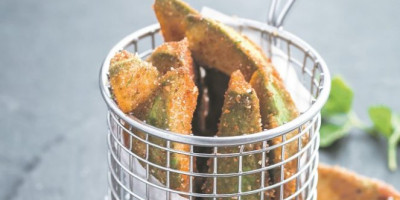 Brašno pomešati sa mlevenim kimom i peršunom, pa posoliti i pobiberiti. Avokado očistiti i iseći na kriške.