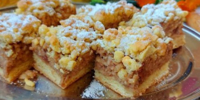 Jabuke izmešati sa cimetom orasima, plazmom i suvim grožđem. Jabuke rasporediti na donju koru a preko jabuka narendati ohlađeno testo koje je bilo u zamrzivaču . Testo ćete lakše rendati ako ga malo umočiti u brašno.