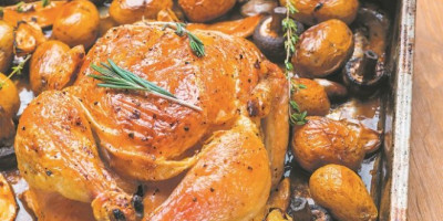 Blago skuvajte pileće meso da skratite vreme pečenja. Odvojeno izdinstajte malo pečuraka krupno isečenih, u njih dodajte so i začine. U posudu za pečenje sipajte izdinstane i začinjene pečurke, usitnjen beli luk u avanu, dodajte krompiriće i piletinu, začinjenu začinima po ukusu i blago namazanu uljem. Dodajte šolju bujona u kome se kuvalo pileće meso. Stavite aluminijumsku foliju i pecite oko 45 minuta na 220 stepeni. Nakon toga sklonite foliju i dopecite pile dok ne dobije zlatnu boju.