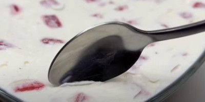 Umutite šlag, pa dodajte kondenzovano mleko, mutite još malo, pa ubacite seckano voće (u snimku je dat primer sa jagodama).
