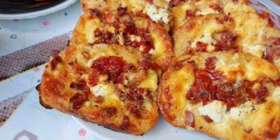 Kriške hleba potopiti u umućeni sastav, pa ređati u pleh koje smo obložiti pek papirom. Preko hleba staviti seckanu šunku, kečap i malo sira.