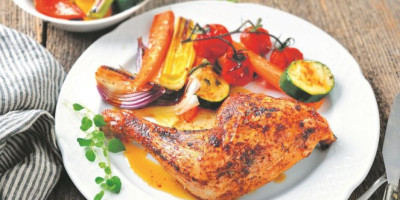 Vatrostalnu činiju premazati maslinovim uljem, pa ubaciti krupnije sečen crveni luk, šargarepu, praziluk, tikvice, čeri paradajz i cele čenove belog luka. Odozgo poređati batake, posoliti, pobiberiti, začiniti origanom, preliti uljem i peći u rerni na 190 stepeni 35-40 minuta, uz povremeno okretanje i mešanje, da meso dobije lepu boju sa svih strana.