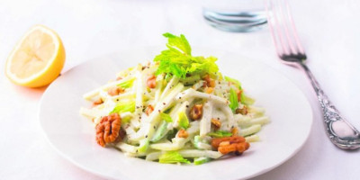Pomešajte celer i jabuku i pospite sokom od limuna. Pomešajte pavlaku i majonez, pa prelijte preko celera i jabuka.