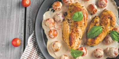 Čeri paradajz oprati, prosušiti, staviti u pleh, preliti uljem, pa posoliti, pobiberiti i začiniti origanom i bosiljkom. Peći u rerni na 200 stepeni desetak minuta. U međuvremenu meso iseći na deblje šnicle, začiniti, te ispržiti u tiganju na malo zagrejanog ulja, da porumeni sa svih strana. Izvaditi i staviti na toplo, a u tiganj ubaciti maslac i kratko propržiti iseckan beli luk. Dodati supu, mešati minut, pa preliti pavlakom za kuvanje. Krčkati dva-tri minuta, umešati parmezan, vratiti meso, ubaciti čeri, pa odmah poslužiti.