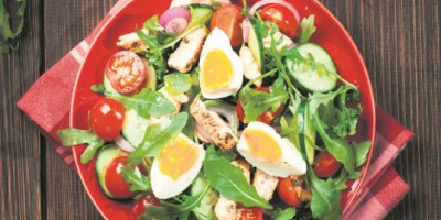 Jaja tvrdo skuvati, prohladiti, oljuštiti, iseći na četvrtine i staviti u činiju. Pileći file iseći na šnicle, začiniti, pa pržiti u tiganju na zagrejanom ulju dok meso ne porumeni sa svih strana. Iseći na komade i dodati u činiju s jajima. Zatim ubaciti rukolu, zelenu salatu, paradajz, krastavac i crveni luk, preliti sokom od limuna i maslinovim uljem, začiniti po ukusu i poslužiti.