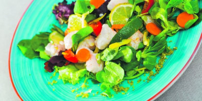 U činiji pomešajte ribu isečenu na komade, bebi-spanać, zelenu salatu i na kolutiće iseckanu šargarepu.