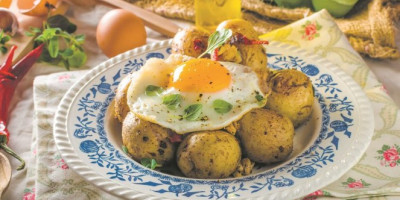 Mladi krompir dobro oprati, pa kuvati desetak minuta u slanoj, ključaloj vodi da malo omekša. Potom ga ocediti i prebaciti u pleh. Dodati cele čenove belog luka, na trake isečene ljute paprike i sitno seckanu slaninu. Posoliti, pobiberiti, začiniti majčinom dušicom i bosiljkom, preliti maslinovim uljem, te peći u rerni na 200 stepeni 25 minuta. U međuvremenu ispržiti jaja na oko, pa poslužiti uz krompir.