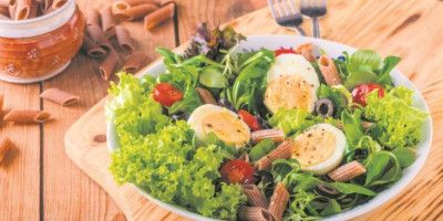 Testeninu skuvati u slanoj, ključaloj vodi, prema uputstvu sa pakovanja, pa ocediti i staviti u adekvatnu činiju za salatu. Jaja tvrdo skuvati, oljuštiti, iseći na polovine i dodati u činiju sa testeninom. Potom ubaciti maslinke, čeri paradajz, zelenu salatu, maslinovo ulje, sok od limuna, so, biber i parmezan, promešati i odmah poslužiti.
