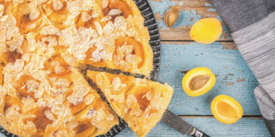 Zamesite testo od navedenih sastojaka, formirajte loptu, zamotajte u prozirnu foliju i ostavite u frižideru na pola sata. Breskve oljuštite i isecite na manje komade. U drugoj posudi umutite jaja i šećer, dodajte brašno, cimet, a zatim mileram. Ohlađeno testo tanko razvaljajte i formirajte po kalupu za pite. Po testu rasporedite breskve i prelijte smesom od jaja i milerama. Pecite 20 minuta na 180 stepeni, pospite listićima badema i pecite još dvadesetak minuta. Prohlađenu pitu pospite šećerom u prahu.