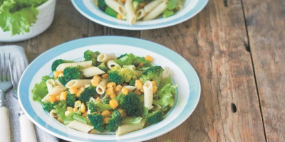 Testeninu skuvati u slanoj ključaloj vodi, prema uputstvu sa pakovanja, pa ocediti i staviti u činiju. Brokoli iseći na cvetove i kratko blanširati u ključaloj vodi. Dodati u činiju sa testeninom, pa ubaciti kukuruz i iscepkane listove zelene salate. Preliti maslinovim uljem i sokom od limuna, posoliti, pobiberiti i začiniti peršunom, promešati i odmah poslužiti.