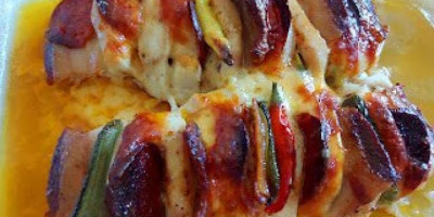 Pileće grudi iseći popreko malo dublje, posoliti i utrljati začin za piletinu, pa naizmenično stavljati kačkavalj, slaninu suvu kulen , krastavčiće i feferone.
