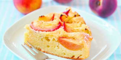 Dobro promešajte i smesu izlijte u podmazan pleh. Preko poređajte isečene breskve. Kolač pecite u zagrejanoj rerni na 200 stepeni oko pola sata. Ohladite kolač i pospite šećerom u prahu.