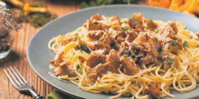 Špagete skuvati u ključaloj, slanoj vodi, po uputstvu sa pakovanja. U većem tiganju na umerenoj vatri zagrejati maslac, pa pržiti iseckan beli luk 30 sekundi. Dodati iseckane lisičarke, začiniti, pa pržiti uz povremeno mešanje sedam minuta. Dodati pavlaku i parmezan, mešati minut, ubaciti oceđenu testeninu i pola šolje vode u kojoj se kuvala, te krčkati još tri-četiri minuta.