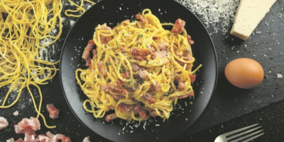 Blago pritisnite čenove belog luka, da puste sok, pa ih dodajte slanini. Kada postane staklasta, ocedite višak masnoće, pa joj dodajte oceđene tople špagete i prelijte umućenim sosom sa žumancima i sirom. Vratite na isključenu toplu ringlu i brzo mešajte da se žumanca ne bi zgrudvala.