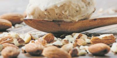 Bademe preliti ključalom vodom, ostaviti ih nekoliko minuta, pa ih procediti i oljuštiti. Zatim ih kratko prepeći u rerni na 180 stepeni, te ih samleti. Žumanca umutiti mikserom sa šećerom i kukuruznim skrobom. Pomešati mleko, slatku pavlaku, pa kuvati na laganoj vatri. Kad smesa proključa, sipati je preko žumanaca. Mešavinu vratiti na vatru i uz mešanje kuvati još dva minuta. Zatim dodati i mlevene bademe, pa sve dobro promešati. Kad se prohladi, staviti u zamrzivač da se stegne. Ukrasiti iseckanim bademima.