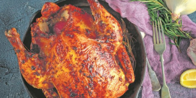 U tiganju na zagrejanom ulju propržiti sitno seckan crni luk, pa dodati mleveno meso, šampinjone, so i biber. Mešati na umerenoj temperaturi dok meso ne porumeni, dodati pirinač, sve dobro sjediniti, te skloniti sa vatre i malo prohladiti. Pile napuniti pripremljenom smesom i privezati batake. Posoliti i pobiberiti, staviti u pleh, preliti otopljenim maslacem, pa peći u rerni na 200 stepeni 60-70 minuta.