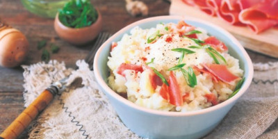 U većem tiganju zagrejati maslinovo ulje, te kratko propržiti sitno seckan crni luk. Dodati izgnječeni beli luk i mešati još minut. Potom ubaciti ispran i oceđen pirinač, pržiti dva minuta uz neprekidno mešanje, pa preliti šardoneom. Kuvati dok alkohol ne ispari, naliti sa dve kutlače supe i mešati dok pirinač ne upije svu tečnost. Postepeno dodavati supu i krčkati dok pirinač ne omekša. Zatim dodati pavlaku za kuvanje, parmezan i iseckanu pršutu, začiniti po ukusu, mešati još dva-tri minuta, pa poslužiti.