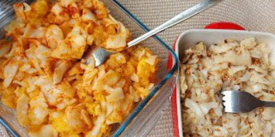 U činiju sipati skuvanu testeninu, dodati krompir i luk i izmešati. Ja uvek ostavim malo testenine, pa dodam šećer i malo oraha da se zasladimo. .