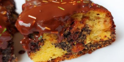 Sipati 2/3 testa testa u pleh i rasporediti. U ostatak testa dodati mak i promešati. Sipati preko svetlog dela i kašikom poravnati. Možete neki štapićem promešati i ostaviti tako.