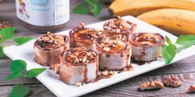 Pomešati namaz od čokolade i lešnika sa mlekom, pa dobijenom smesom premazati palačinke. Na svaku potom staviti po manju oljuštenu bananu, te urolati. Seći na komade širine dva prsta i ređati na tacnu. Preliti sosom od čokolade, posuti grubo usitnjenim orasima, te odmah poslužiti.