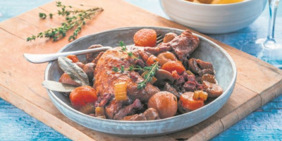 U tiganju propržiti slaninu, pa je izvaditi i staviti sa strane. Batake posoliti i pobiberiti, uvaljati u malo brašna, pa ih propržiti na masnoći od slanine. Meso izvaditi iz tiganja, pa ubaciti crni i beli luk i šargarepu. Posoliti i dinstati uz mešanje nekoliko minuta. Preliti konjakom i flambirati povrće. U veću šerpu ubaciti flambirano povrće, meso, slaninu i pečurke, preliti vodom i vinom, posoliti, pobiberiti i pošećeriti, naliti sokom od paradajza, pa krčkati na umerenoj temperaturi oko 30 minuta. Po želji jelo kratko zapeći u rerni, pa poslužiti dok je toplo.