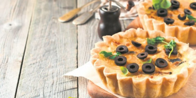 Od brašna, ohlađenog maslaca isečenog na listiće, jajeta, pavlake i soli zamesiti testo, pa ga staviti u frižider da odstoji pola sata. U međuvremenu u tiganju zagrejati ulje, pa kratko propržiti luk i piletinu isečenu na kockice. Umutiti jaja sa pavlakom, pa dodati izrendan kačkavalj i iseckane maslinke. Testo razvaljati, prebaciti u pleh, izbockati, pa peći u rerni na 180 stepeni desetak minuta. Izvaditi, odozgo rasporediti piletinu i luk, preliti smesom od jaja, pa peći još 35-40 minuta.