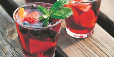 Šolju voća staviti u bokal, dodati iseckanu pomorandžu i šećer, pa sve dobro izgnječiti. Dodati vino, brendi i sok od pomorandže, pa promešati. Ohladiti u frižideru, dodati preostalo voće, naliti sa malo kisele vode, pa poslužiti.