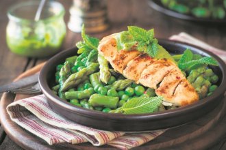 U blender staviti iseckanu nanu, preliti vodom, dodati sirće, šećer, malo soli i bibera, pa izmiksati. Ostaviti da odstoji 20 minuta. Piletinu iseći na šnicle, posoliti, pobiberiti i začiniti origanom i bosiljkom, pa peći na roštilju ili u gril tiganju dok ne dobije lepu boju sa svih strana. Grašak obariti u ključaloj vodi, a šparge iseći na komade i kratko propržiti na maslacu. U činiju staviti oceđen grašak, špargle, sveže ceđeni sok limuna, so i biber, pa sve dobro promešati. Odozgo staviti grilovano meso, preliti sosom i odmah poslužiti.