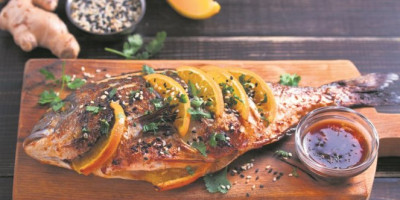 Oradu oprati, očistiti, prosušiti, pa posoliti i pobiberiti spolja i iznutra. Na nekoliko mesta oštrim nožem zaseći ribu s obe strane, u proreze staviti pomorandžu isečenu na kriške. Ribu prebaciti u podmazan pleh i preliti uljem. Peći u rerni na 200 stepeni oko 20 minuta. U međuvremenu pomešati vino, iseckan peršun, beli luk, ruzmarin i sok od limuna, pa preliti ribu dobijenom smesom i peći još 15 minuta.