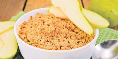 Rernu zagrejati na 180 stepeni. Kruške oljuštiti i iseći na komade, pa dinstati sa šećerom i sokom od pola limuna desetak minuta dok ne omekšaju. U međuvremenu napraviti testo. Pomešati šećer i brašno, dodati maslac i ostale sastojke i mesiti rukama dok se ne dobiju mrvice. Pripremljene kruške sipati u vatrostalnu posudu i ravnomerno posuti mrvicama. Peći 30 minuta dok testo ne dobije žućkastu boju. Služiti toplo uz šlag ili kuglu sladoleda.