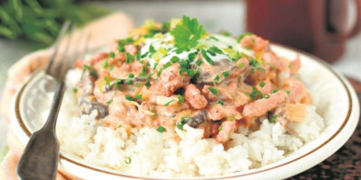 Šampinjone oprati i iseći na listiće, a crni luk na rebarca. Celer i tikvice očistiti i iseći na kocke kao i piletinu. Na ulju propržiti crni luk dok ne dobije staklast izgled. Dodati usitnjen beli luk i meso i naliti s malo vode da se dinsta. Kad se mirisi sjedine, dodati i celer. Dinstati na laganoj vatri oko pola sata, pa ubaciti iseckane šampinjone i tikvice. Umesto mešanja protresti šerpu. Začiniti po ukusu i sipati pavlaku za kuvanje. Neka se krčka još pet minuta na tihoj vatri. Služiti uz bareni pirinač.