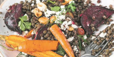 Sočivo naliti vodom, posoliti, kuvati dok ne počne da ključa, pa promeniti vodu, vratiti na vatru i krčkati još 50 minuta da lepo omekša. U međuvremenu cvekle i šargarepe dobro oprati, staviti na aluminijumsku foliju, preliti sa malo ulja, posoliti i pobiberiti, pa čvrsto umotati i peći u rerni na 200 stepeni oko 40 minuta. Potom ga oguliti, iseći na krupne komade, staviti u činiju, pa dodati sočivo, lešnike, iseckan peršun, maslinovo ulje, balzamiko i izmrvljeni feta-sir. Promešati i odmah poslužiti.