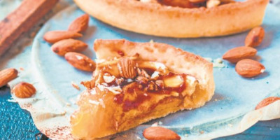 U blender staviti brašno, šećer i so, pa kratko izmiksati. Dodati maslac, ulje i četvrt šolje ledene vode, te miksati dok se ne dobije ujednačeno testo. Prebaciti na radnu površinu, zamesiti, uviti u plastičnu foliju i staviti u frižider na 60 minuta. U šerpici na umerenoj vatri uz mešanje otopiti šećer, maslac, so i kašiku vode, pa kad počne da peni, skloniti sa vatre, dodati mleko i sve dobro sjediniti. Na kraju ubaciti na kockice isečene jabuke i cele bademe. Testo razvaljati oklagijom, staviti u pleh, filovati pripremljenom smesom i peći u rerni na 200 stepeni oko 55 minuta.