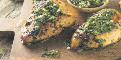 U blender staviti bosiljak, orahe, beli luk, parmezan i ulje, pa dobro izmiksati, da se dobije ujednačena smesa. Dodati sok od limuna, promešati i staviti sa strane. Piletinu posoliti i pobiberiti, pa peći u gril tiganju na umerenoj temperaturi po pet-šest minuta sa svake strane. Izvaditi na tanjir, preliti pesto sosom, pa odmah poslužiti.