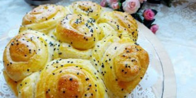 Istresti na sto razviti u pravougaonik 2 cm premazati maslinovim uljem i iseći na trake. Uviti svaku traku kao puža i ređati u podmazan pleh.