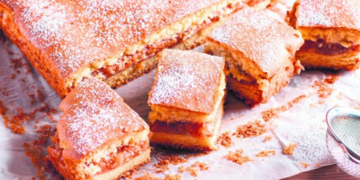 Preko stavite smesu s jabukama, a onda pokrijte drugim delom testa. Izbockajte vuljuškom gornju koru i stavite da se peče na 180 stepeni oko 40 minuta. Secite tek kad se potpuno ohladi i po želji pospite šećerom u prahu.