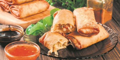 Piletinu i pečurke iseći na što sitnije kocke. U voku ili većem tiganju zagrejati kašiku-dve ulja, pa pržiti meso i pečurke tri minuta uz mešanje. Dodati soja sos, promešati, pa ubaciti rendanu šargarepu, iseckan mladi luk i đumbir. Posoliti, pobiberiti i po želji dodati ojster sos (sos od ostriga), mešati dva-tri minuta, pa skloniti sa vatre i prohladiti. Kore za pitu iseći na 16 pravougaonika, filovati pripremljenom smesom, krajeve premazati belancetom, pa uviti u rolnice. Pržiti u vrelom ulju dok rolnice ne dobiju lepu boju sa svih strana.