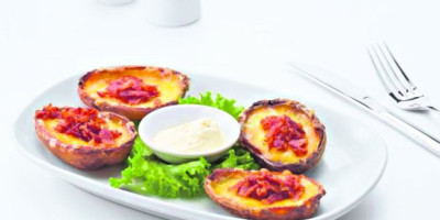 Pred kraj pečenja po površini krompira stavite seckanu slaninu i narendan kačkavalj, pa zapecite da se sir istopi. Služite uz salatu ili sos po izboru.