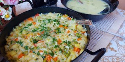 Luk, šargarepu iseckati i propržiti, dodati grašak, karfiol, krompir na kockice, papriku, opran pirinač.